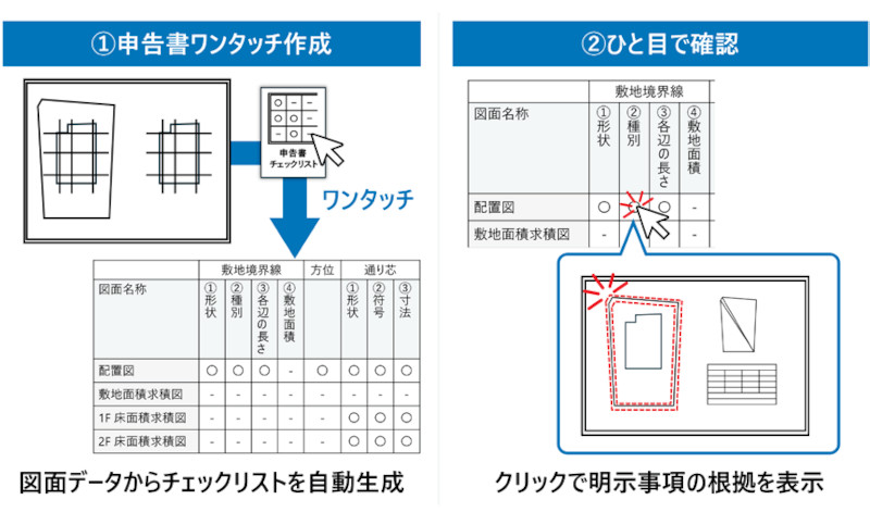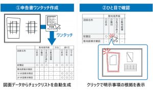 「図面審査対応のために、確認作業が増えそうだ」という声がある中、手動での照合・作成に約4時間を要する申告書作成業務を、ワンタッチで完了できる。