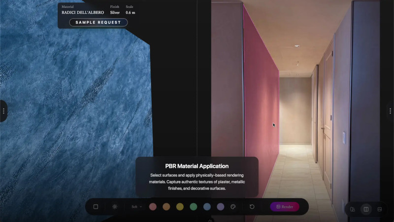 今回発表した「Stucco 3D Simulator」は、AIと物理ベースの3Dレンダリング技術を駆使し、スマートフォンやPC画面上で、服を試着するように建築素材を“試着”できるシステムである。