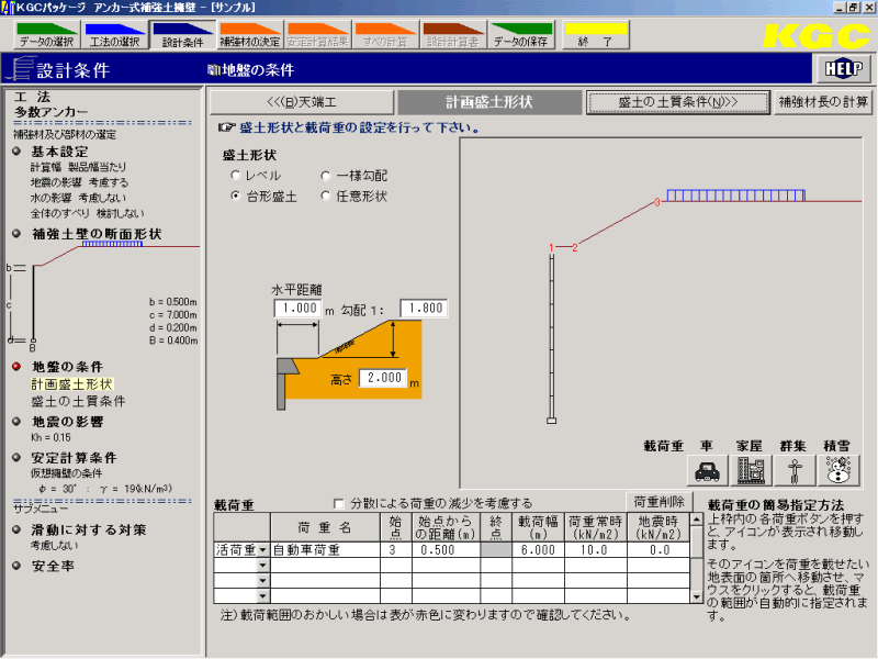多数アンカー式補強土壁工法設計・施工マニュアルに基づいて設計計算を行う。他の「The 補強土」シリーズ参照。天端に防護柵等を設けた場合の天端擁壁の安定計算・各部の断面計算、基礎の重力式擁壁の安定計算まで行う。