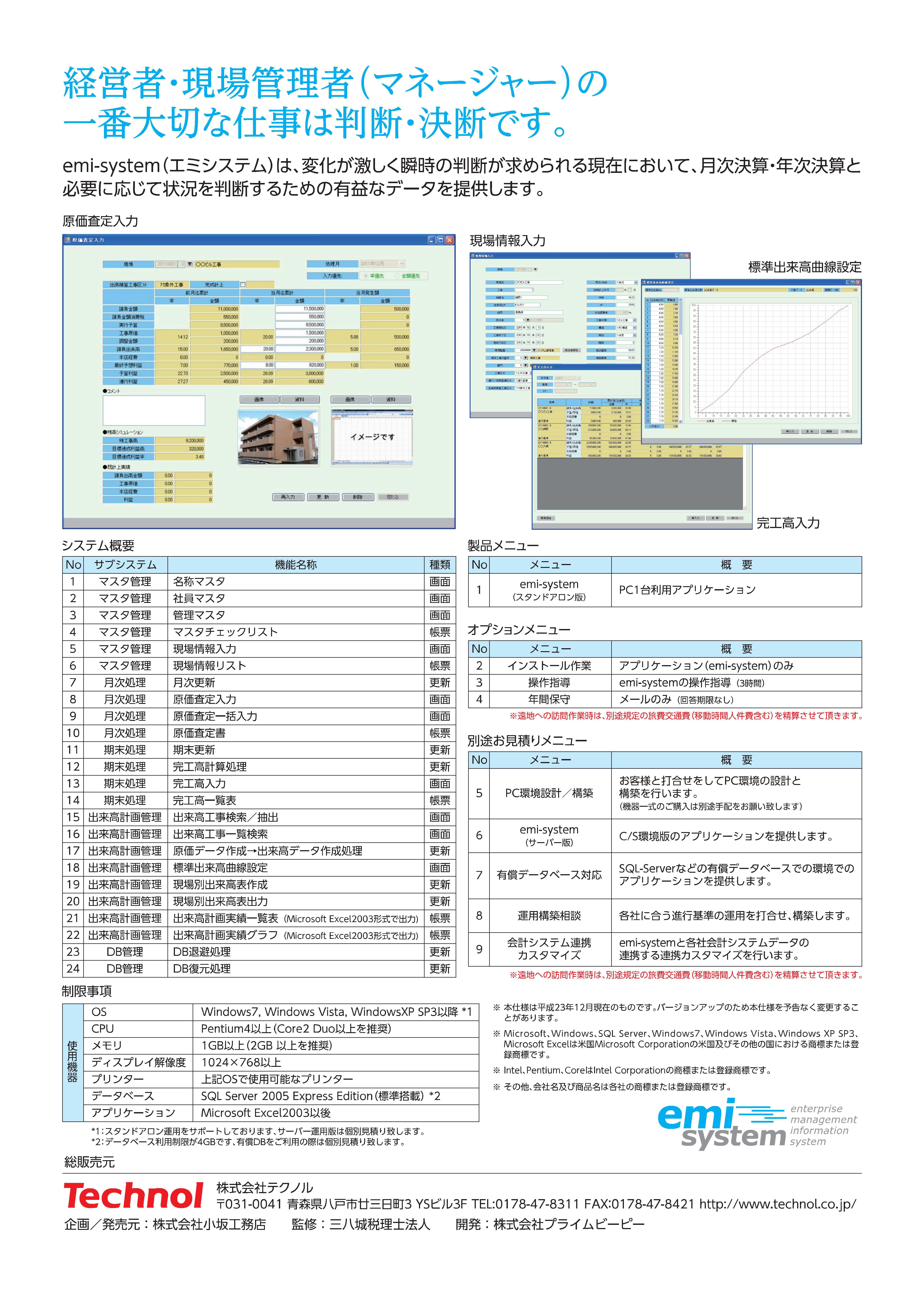 工事の進捗管理: 工事現場の代理人やスタッフが実際に使用し、繰り返し検証することによって誕生したemi-systemは、従来のシステムにはない優れた操作性を実現。 経営判断のための見える化: 工事写真の貼付や出来高のグラフ化など、工事進捗状況により全体が把握しやすく、経営診断をする際の基礎データとして活用できるだけでなく、金融機関の信用度の向上を図ることができる。 コストパフォーマンス&拡張性: 工事進行基準に特化したシステムのため、導入しやすい価格設定。また、必要に応じて基幹業務との連携も可能(オプション)のため、拡張性が高い。