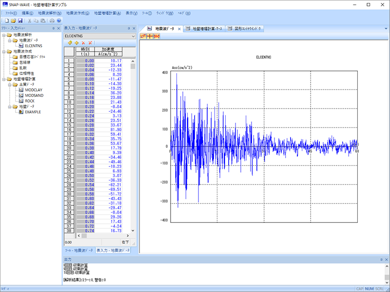 構造物の地震応答解析の入力地震波を作成するソフト。地震波の解析、模擬地震波作成、等価線形化解析(SHAKEの方法)による地盤増幅計算を行う。作成した地震波時刻歴データは、任意形状立体フレームの弾塑性解析ソフト「SNAP」で読み込んで使用できる。
