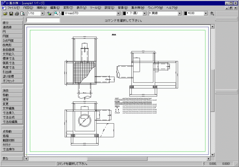 土木汎用CAD「V-nas」をプラットフォームに、集水桝の自動作図を行うもので、形状寸法と接続する水路を設定するだけで、平面図・側面図および数量計算欄を自動作図する。