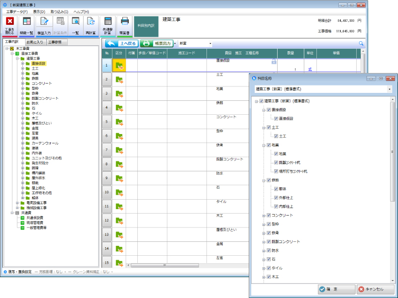 建築物の新築・改築・増築・撤去、電気設備、機械設備、昇降機設備に加え、公共住宅建設工事、首都高速道路発注の工事など幅広い施工に応じた積算が可能。豊富な資料・基準を元に歩掛・単価データも充実、複合工事においても一つの設計書内での合算に対応。さらに、工事データをサーバー上で管理・共有できる工事管理機能などの新機能も搭載され、業務の合理化・省力化が考慮された積算システムである。