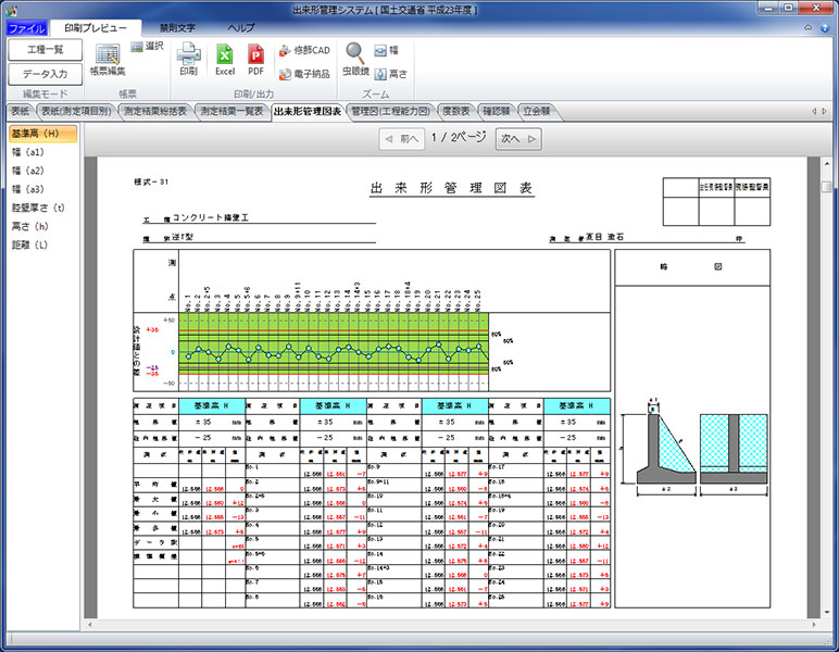 建設土木工事の出来形管理業務を支援するソフト。i-Constructionや全国各地域の土木共通仕様書に対応。略図や測定項目名が登録済みの状態で表示され、設計値と実測値を入力するだけで、かんたん・迅速に美しい帳票を作成可能。全国各地域の共通仕様書をマスターとして搭載しているため、仕様書を開く手間を削減。