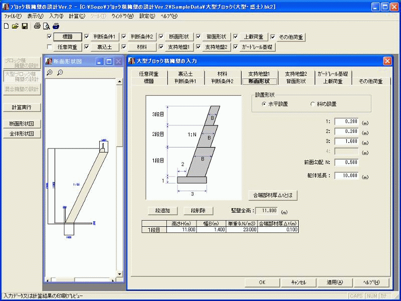 ブロック積擁壁・大型ブロック積擁壁・混合擁壁と3種類の擁壁の設計を行う。 大型ブロック積擁壁については断面計算も可能。