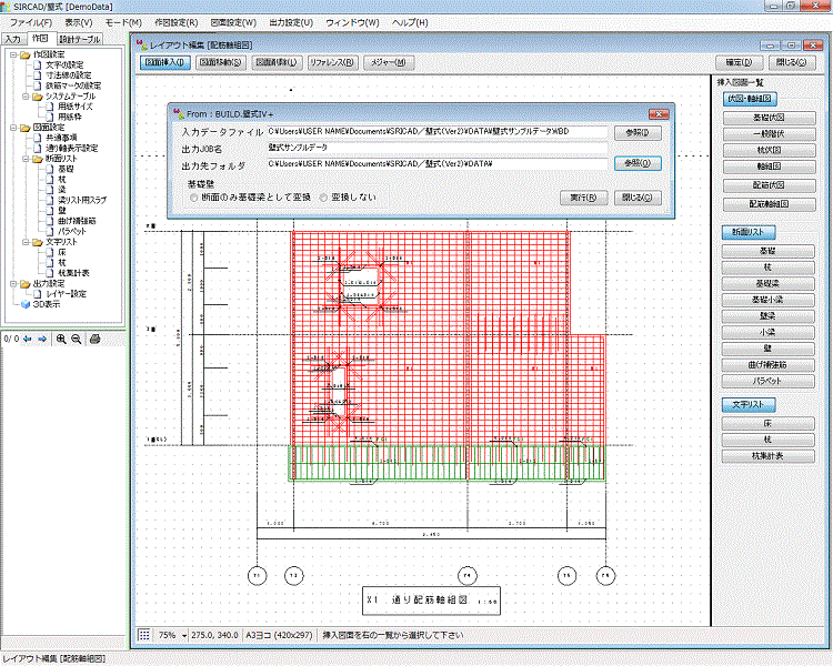 「SIRCAD/壁式」は、壁式鉄筋コンクリート造建築物のモデル入力機能および、申請に必要な各種図面の自動作図機能を備えたプログラム。一つの建物モデルから図面を作図するため、リスト図、伏図、軸組図で整合のとれた図面を作図することができる。また、オプションとして一貫計算プログラムのデータをインポートする機能も備えている。