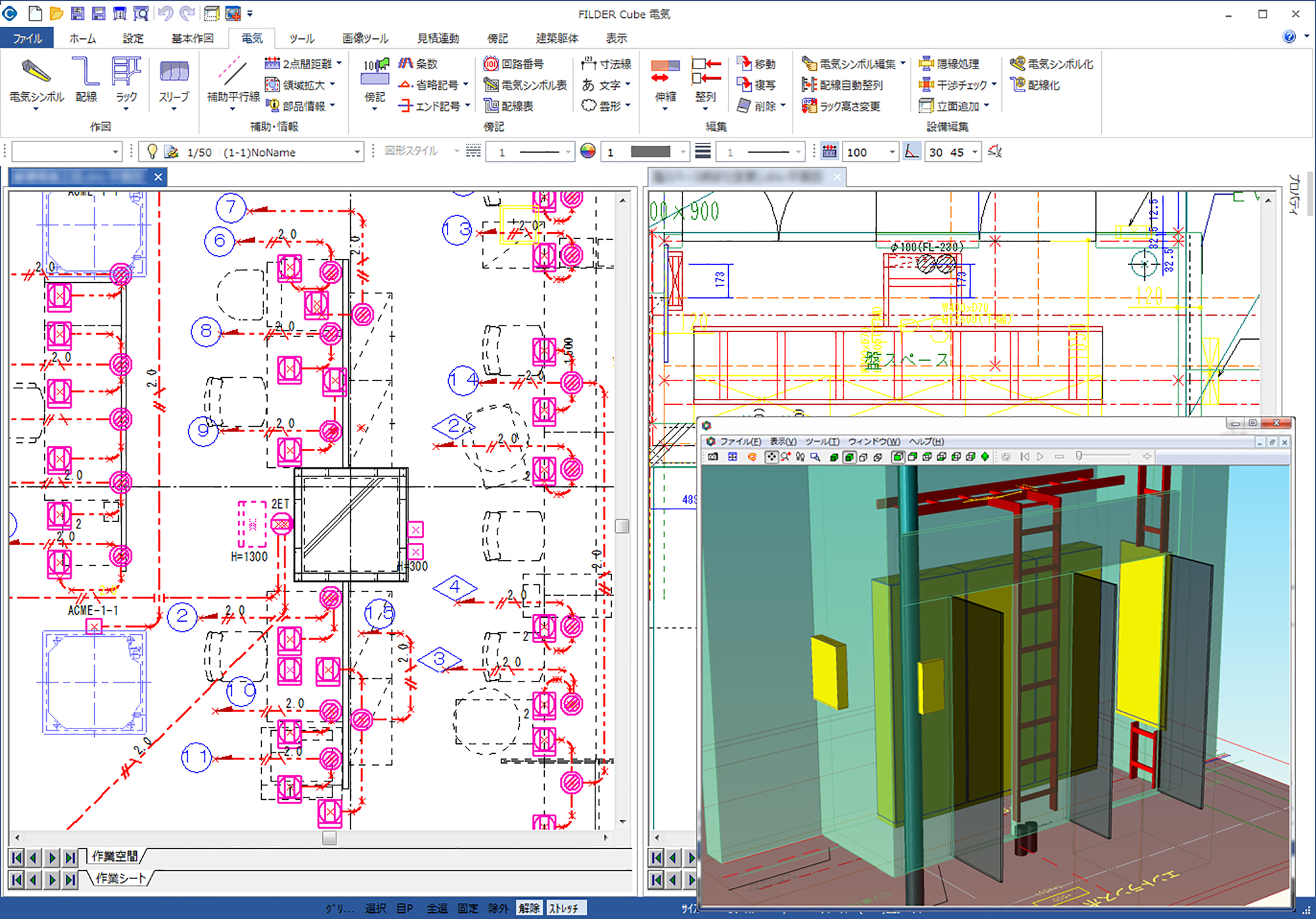 ダイキン工業の「FILDER Cube 電気」は、電気設備に特化したCAD。ExcelやWord感覚のやさしい操作性。パナソニック照明器具情報の取り込み機能搭載(ルミナスプランナーライトとデータ連携)。シンボル登録数が豊富で、検索と配置も簡単。配線、配管がテーブル化されているため、自由に組み合わせ、さまざまな配線パターンから作図できる。シンボル表や配線表は自動作成。ラック作図も簡単。リアル3Dで干渉チェックし、容易に編集できる。