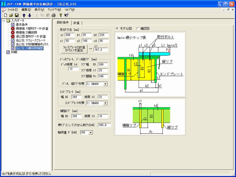 JSP-18Wは、道路橋示方書・同解説?共通編、?鋼橋・鋼部材編(平成29年11月)、鋼橋伸縮装置設計の手引き(平成17年4月、日本橋梁建設協会)、鋼製フィンガージョイント設計指針※1(平成15年2月、NEXCO)、鋼構造物設計基準(平成11年10月、名古屋高速道路公社)、鋼構造物設計要領(案)(平成12年2月、名古屋高速道路公社)に基づき、鋼製フィンガージョイント(片持式)の詳細設計を一貫して行う。 ※1 NEXCOのフィンガージョイントについては、鋼製フィンガージョイント設計指針が平成29年道路橋示方書に対応後、検討する。