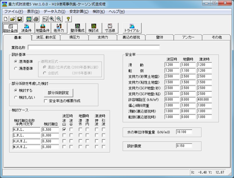 港湾・漁港基準に準拠し、重力式防波堤の安定検討(滑動、転倒、支持力、ケーソン浮遊時、セルラー抜け出し)を行うシステムである。ケーソン・セルラー・直立消波・任意形状のブロックに対応している。