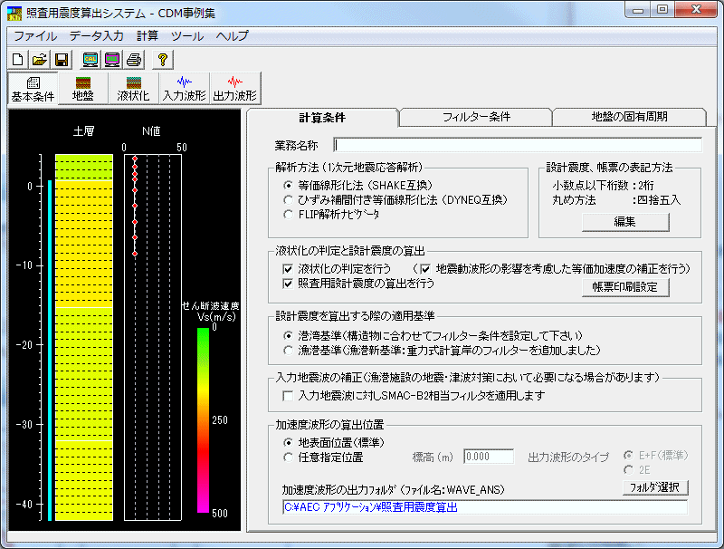 工学基盤に入射した加速度時刻歴波形を基に、地表面位置の加速度時刻歴波形を1次元地震応答解析(等価線形化法) により求める。解析アルゴリズムはSHAKE互換/DYNEQ互換から選択。オプションとしてFLIPナビゲータを用意。液状化の予測・判定、フィルター処理による設計震度の算出を行う。
