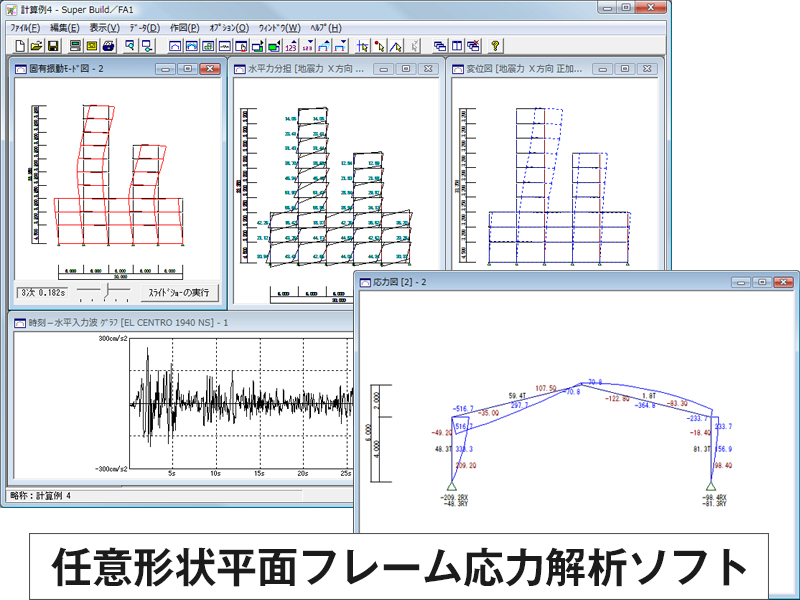 線材要素で構成された任意形状平面フレームに荷重、支持条件を与え、各種解析を行うソフトウェア(プログラム)。弾性解析、弾塑性解析、応答解析、固有値解析が可能で、他のソフトウェアとの連携機能も用意されている。