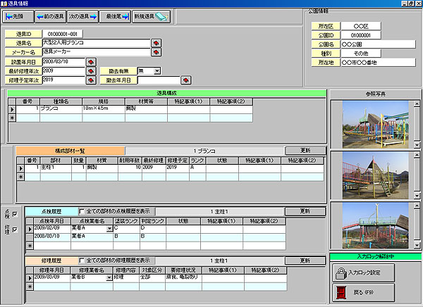 公園情報、施設情報、点検状況、修理状況を一元管理。 遊具の安全点検においては、常に迅速かつ正確な対応が必要。本システムでは、公園管理データの保持、必要な情報の閲覧、報告書の作成をサポート。オプション機能として長寿命化計画の管理・策定機能も備える。