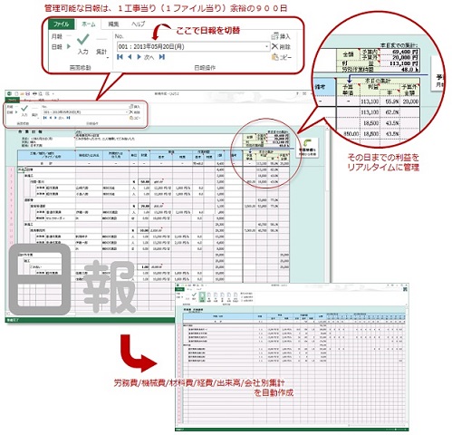 日々の日報を作成するだけで、作業人員、作業機械、仕様材料を自動集計する。累計の利益、作業時間、金額をリアルタイムで確認することもできる。月報にも対応。